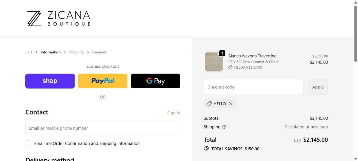 Get an extra $150 off at Zicana Boutique - enter code HELLO at checkout.