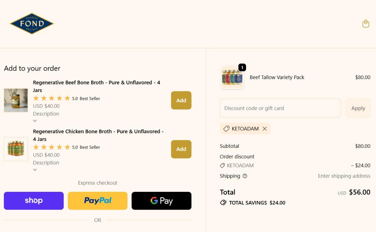 Enjoy 30% off all your orders at Fond Bone Broth. Use coupon code: KETOADAM at checkout!