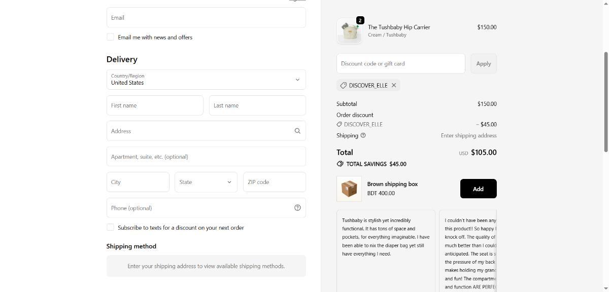 Save 35% plus free shipping on your Tush Baby order with coupon DISCOVER_ELLE.