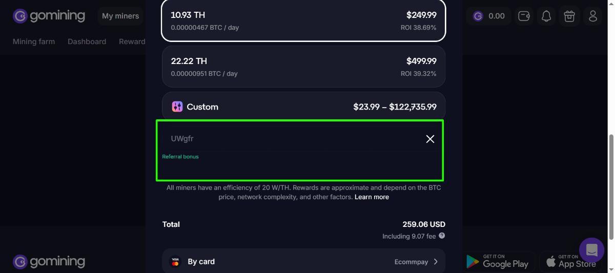 Free GoMining trial miner and 5% cash back on your first miner purchase - using promo code: UWgfr at checkout!