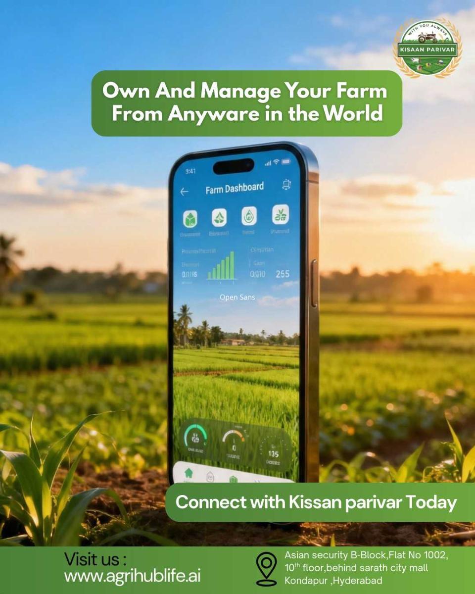 AgriHub Life is a smart remote-farming platform designed for NRIs and urban professionals who want to manage their farmland from anywhere in the world. Using AI, satellite monitoring, live dashboards, and trained farm managers, AgriHub Life ensures transparent, professional, and profitable cultivation. Trusted by the ethos of Kisaan Parivar, the platform makes agriculture safe, predictable, and accessible from