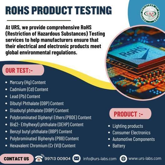 URS ROHS Compliance Testing Laboratory in Chennai provides accurate and reliable testing services to ensure products meet Restriction of Hazardous Substances (RoHS) directives. Equipped with advanced instrumentation, the lab tests electronic and electrical products for hazardous substances, helping manufacturers comply with environmental regulations and market their products globally with confidence.