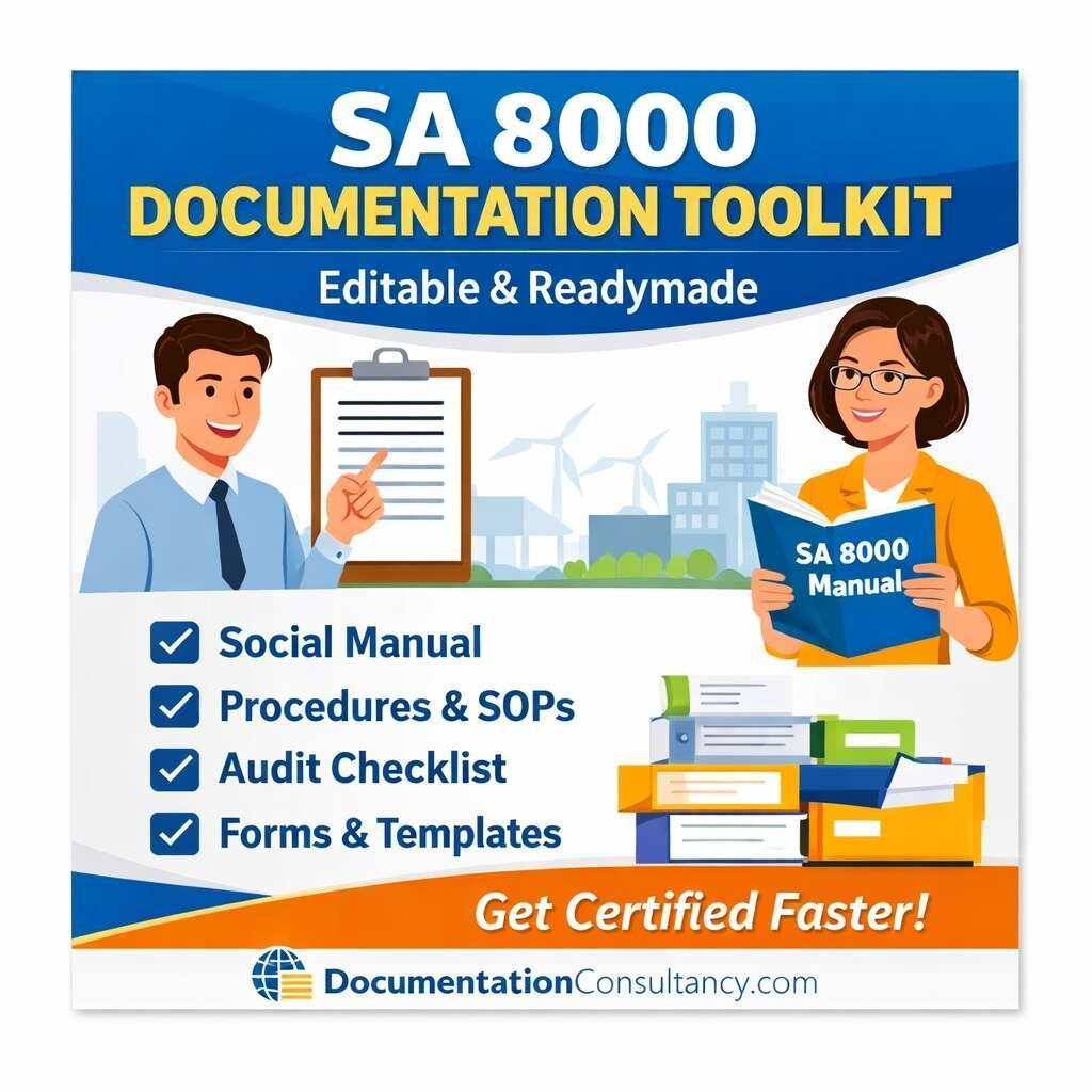 Documentationconsultancy.com offers a complete SA 8000 Documents toolkit designed to meet the latest SA8000 Social Accountability standard requirements. These editable, readymade SA 8000 documents help organizations implement and maintain compliance with ease while saving time and certification costs.