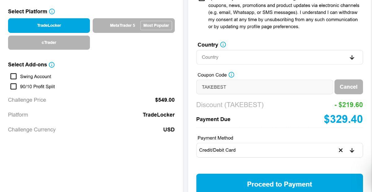 Use coupon code: TAKEBEST at checkout to get up to 40% OFF challenge accounts at FunderPro.