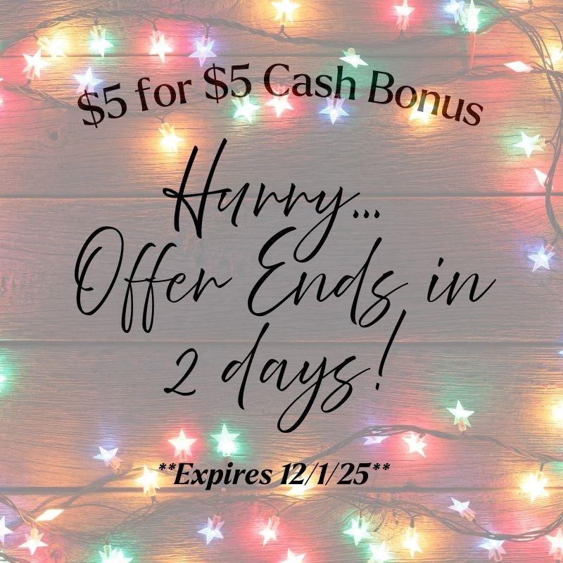 Register now to receive your free cash bonus. But wait! Join now and take advantage of our $5 for $5 free cash bonus offer now before it expires!