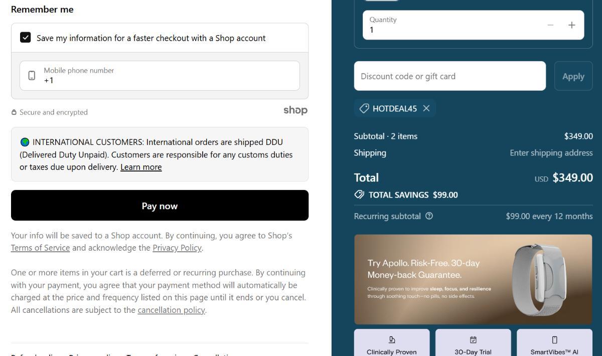 Get $99 discount on any order by applying this Apollo Neuro coupon code: HOTDEAL45 at checkout, with free shipping!