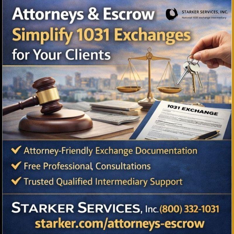 Attorneys and escrow professionals: ensure smooth, compliant real estate closings when your clients are completing a §1031 tax-deferred exchange. Starker Services, Inc. is the nation’s oldest and most experienced independent Qualified Intermediary, trusted by attorneys, title companies, and escrow officers nationwide to support accurate documentation and IRS-compliant exchanges.