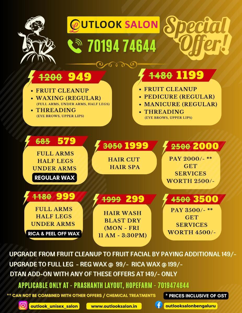 "Welcome to Outlook Uni*** Salon & Nail Art - AWHO, Sandeep Vihar, a top-rated beauty destination located in the heart of Bengaluru. Our salon offers a wide range of services for both men and women, including haircuts, hair styling, coloring, and specialized treatments like keratin and nanoplastia. With expert beauty treatments such as facials, makeup, waxing, and nail art, we are the ultimate beauty parlour and salon near you. Conveniently located near Assetz Marq Whitefield and Sandeep Vihar shopping Complex, we offer bridal packages and home service options. Discover the best uni*** salon in town for a flawless you!"