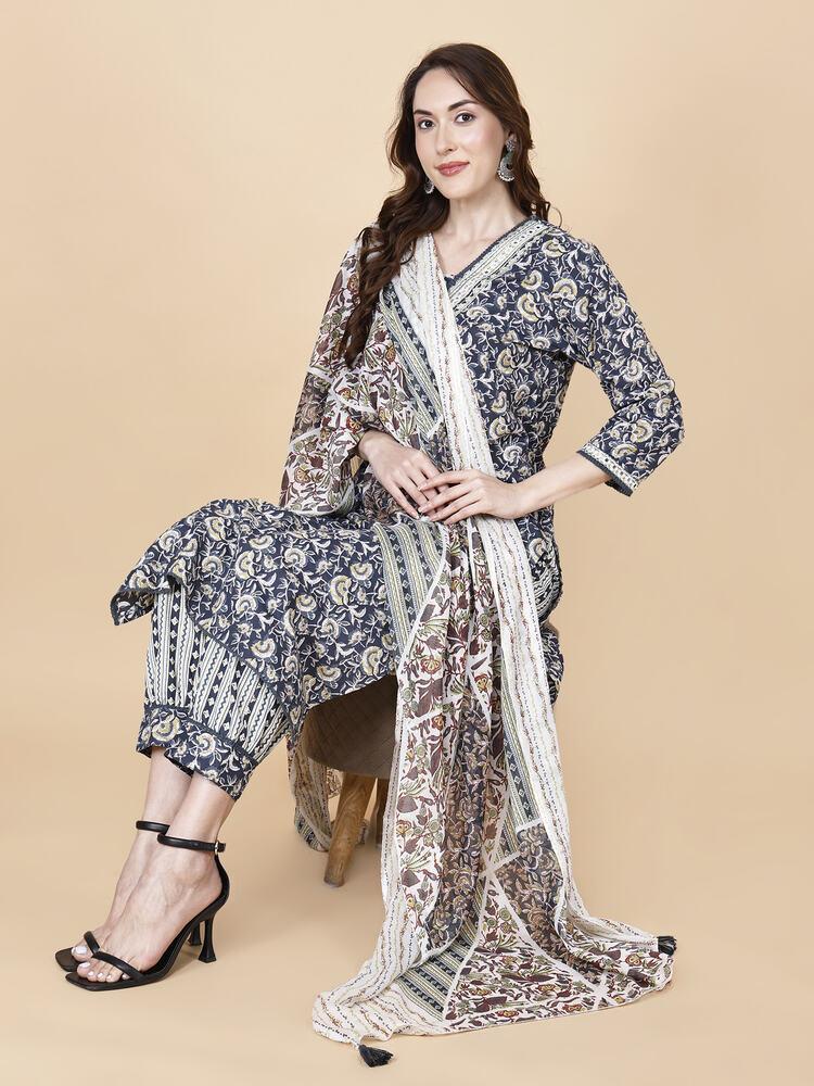 The rich navy blue shade makes it a versatile choice for weddings, festive occasions, family gatherings, or evening outings. Made with high-quality fabric, it ensures all-day comfort while keeping you stylish and confident. Whether you’re celebrating a special moment or simply want to enhance your ethnic collection, this 3 piece navy blue suit online will highlight your natural grace.
