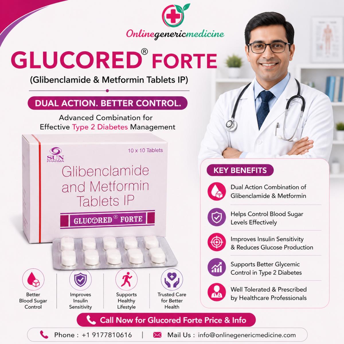 Explore Glucored Forte tablet, a glibenclamide metformin combination for type 2 diabetes control. Learn how metformin and glibenclamide work together, dosage details, and benefits. Compare glibenclamide and metformin hydrochloride tablets with Glucovance and Glucovance generic options.