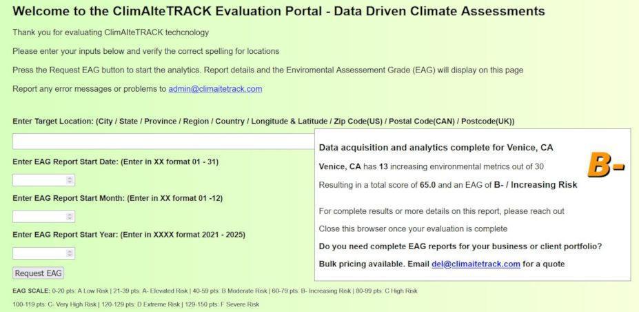 ClimAIteTRACK – Climate change is creating huge shifts in how insurance businesses operate. ClimAIteTRACK is a premium revenue and client management tool that helps insurance companies better strategize in the current landscape. Try it out and get an 'EAG' for any location. Reach out for access.