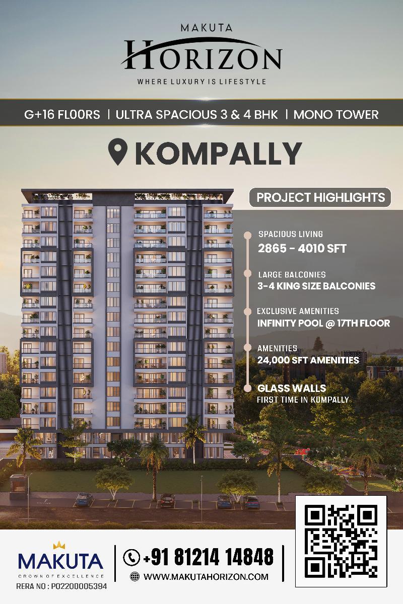 Makuta Horizon presents premium 3 & 4 BHK corner apartments for sale in Kompally, designed with elegant glass walls, a stunning 180-ft infinity pool, and world-class amenities. Nestled in one of the best gated communities in Kompally, North Hyderabad, it offers the perfect blend of luxury, comfort, and serenity. With seamless connectivity to key destinations, these luxury gated community apartments in Kompally are ideal for homebuyers and investors seeking a modern, high-quality lifestyle.