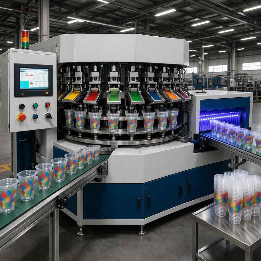 Ideal for printing on plastic cups, bottles, containers, and promotional products. Features rotary system, advanced automation, and high-speed output.