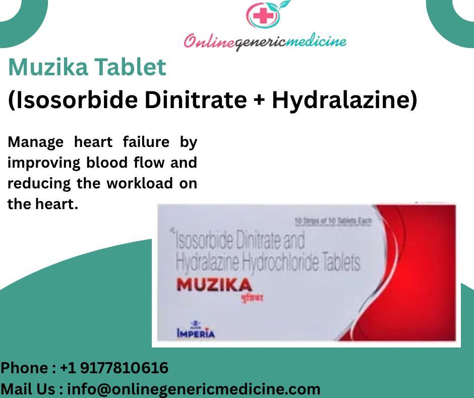 Muzika Tablet, a combination of hydralazine and isosorbide dinitrate, is a medication used to manage heart failure. This medication helps relax blood vessels, improve blood flow, and reduce cardiac workload. Learn about Muzika Tablet uses, benefits, and safety information, at www.onlinegenericmedicine.com
