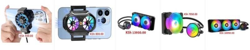 Single fan phone cooler - 500.00 Dual Fans Phone cooler - 800.00 120mm RGB Water Cooler Liquid - 7950.00 MSI MAG CORELIQUID 240R V2 240mm Liquid Water CPU Cooler - 13950.00 360mm CPU Water Liquid Cooler - 16950.00