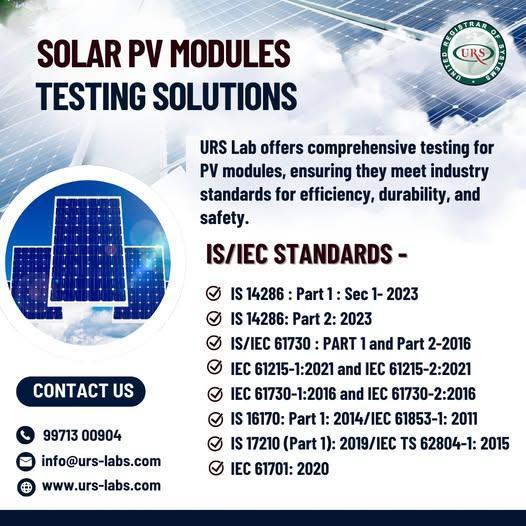 URS provides reliable Solar PV Modules Testing Services in Indore, ensuring quality, performance, and safety of solar panels. Equipped with advanced technology and expert professionals, URS conducts rigorous testing as per national and international standards. These services help manufacturers verify durability, efficiency, and compliance, supporting the development of high-quality and sustainable solar energy solutions.