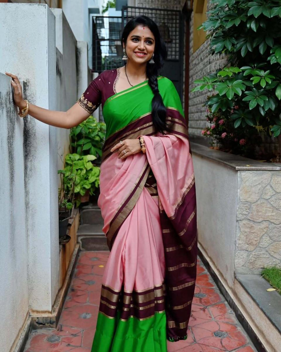These sarees blend two rich hues, enhancing depth and sophistication while maintaining that signature Mysore silk glow.