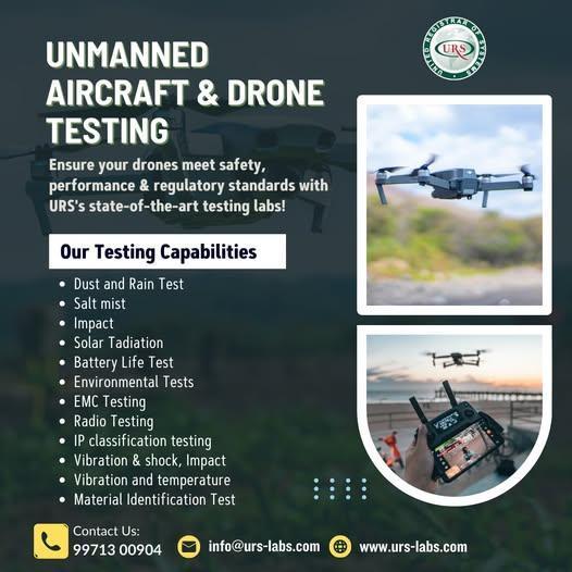 URS Unmanned Aircraft Vehicle Testing Laboratory in Chennai provides advanced testing solutions for drones and UAV systems to ensure safety, performance, and regulatory compliance. Equipped with modern infrastructure and expert engineers, URS conducts flight performance, durability, EMI/EMC, and environmental testing. Choose URS for reliable UAV testing services in Chennai to meet industry standards and enhance product quality.