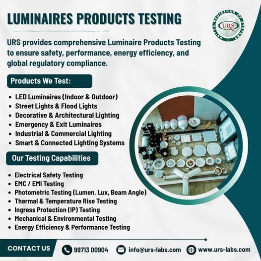 URS offers reliable Luminaries and LED Bulb Testing Services in Manesar, ensuring compliance with national and international standards. Our advanced lab evaluates performance, safety, durability, and energy efficiency. We support manufacturers with accurate results, faster turnaround, and expert guidance to help deliver high-quality, certified lighting products to the market.